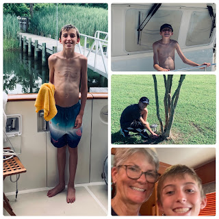 Our first days home would be spent washing the hull and the windows to get all the salt off from the two week trip home from Kemah, Texas. Normally it would be Greg and I working to clean her up but unfortunately we had a small incident that would put Greg out of commission for a bit. Seems as he was disembarking from the boat he reached back over to do something and “miss stepped” and fell into the water. He injured his shoulder and knee and could not do anything but wait for an appointment with his orthopedic surgeon to make sure he had not torn his rotator cuff repair. With that, our grandson, Ian picked up and helped to get the job done.